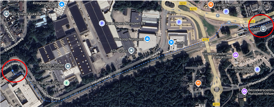 (De lichtblauwe lijn geeft de wandelroute vanaf NS station Nunspeet aan tot onze locatie aan de Industrieweg 47. In de rode cirkels het station en onze locatie.)