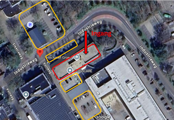 (U kunt uw auto direct voor het gebouw parkeren. Mocht deze plaatsten bezet zijn dan kunt u op de andere oranje aangegeven parkeren.)